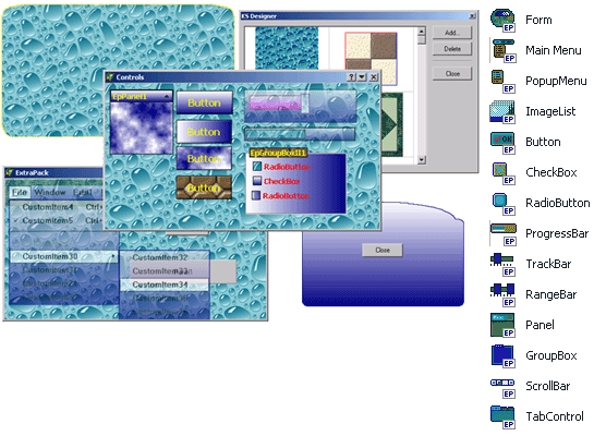 위 데모에서 보다시피, 비정형 폼, 다양한 형태의 버튼들, 메뉴, 그밖에 체크박스나 패널, 그룹박스,